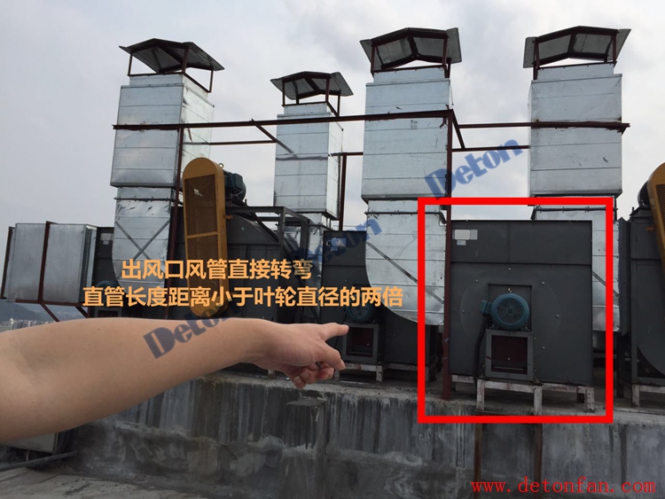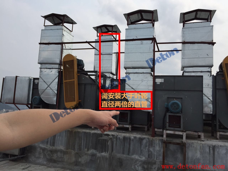 小分隊糾正:彎頭距離風(fēng)機出風(fēng)口直管的長度最好是葉輪直徑2倍,但是最小不能少于1.5米,此圖需安裝直管拉開與風(fēng)機的距離。